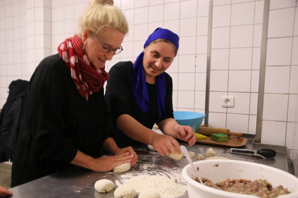 Am Nachmittag bereiteten bereits die Asylsuchenden kleine Speisen vor. Unter den Stationen wünschten sich auch einige einen traditionellen Kartoffelsalat. Weiterhin bereiteten Kinder und Erwachsene in der Küche, Stockbrot für das Lagerfeuer für die Kinder vor. Anderenorts backten die Gäste dünnes Fladenbrot oder schnitten flink Gemüse für Salate oder bereiteten Kichererbsen Humus zu.
