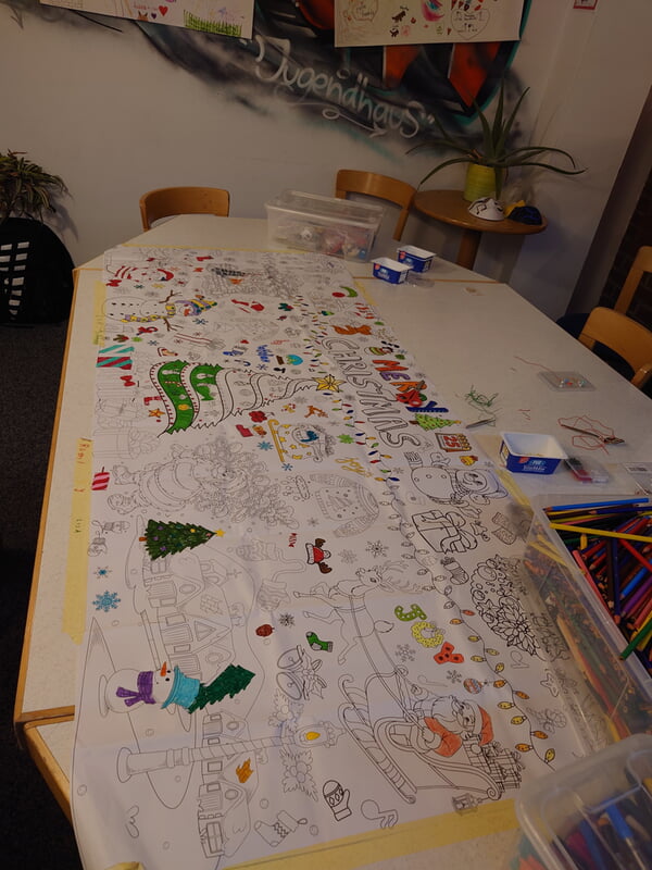 Am 27.11. wurde es im Kids Café dann richtig weihnachtlich: Es wurden Weihnachtsarmbänder gebastelt und ein XXL-Ausmal-Weihnachtsbild gestartet, das in den darauffolgenden Tagen immer weiter ausgemalt wurde. So ist Stück für Stück ein großes, gemeinsames Kunstwerk entstanden.